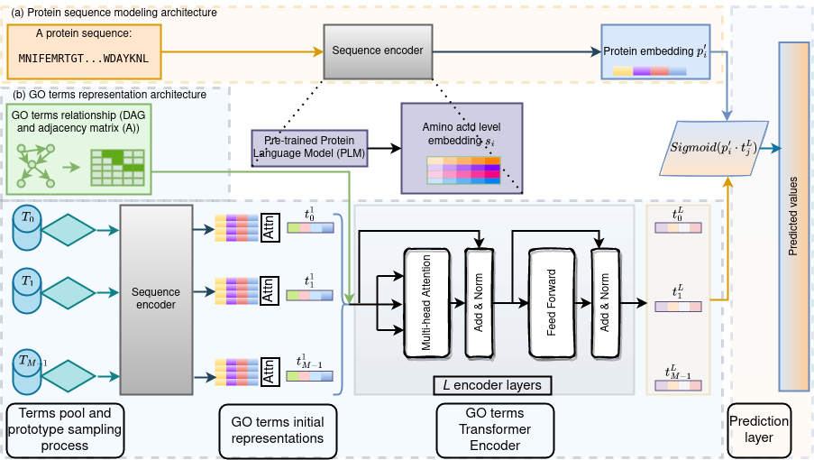 Large molecular language models are emerging as a powerful tool to learn and extract useful information from molecular sentences and linking them to functions. However, these models, typically trained on sequences alone, miss opportunities to integrate data from heterogeneous sources. Inspired by molecular evolution and the relationship between structure, function and properties, we propose models that incorporate multiple molecular representations. As an example, we incorporate mutual functional terms’ relationships as biological priors to annotate proteins from only sequence information. We attribute two key contributions: a novel method that utilizes the transformer architecture in two ways, one for encoding protein sequence and another for encoding functional hierarchy, and a deep investigation of different ways of constructing training and testing datasets. The learned sequence and functional terms’ representations are combined and utilized for multi-label Gene Ontology (GO) term classification. The method is shown superior over three recent representative GO prediction methods. The work also reveals that existing approaches under- or over-estimate the generalizability of a model. A novel approach is proposed to address these issues, resulting in a new benchmark dataset to rigorously evaluate, compare and advance the methods. This work has appeared in Biomolecules, 2022 (impact factor 5.80).